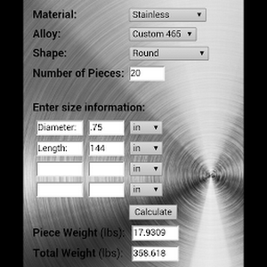 We've taken our popular metal weight calculator and made an app out of it for Android Phones. Quickly compute total and piece weights for estimating material and shipping costs. The app asks for permission to access your network, but the only time it will access the network is to take you to the internet if you decide to fill out our request for quote form and click on the link from within the app. There is no hidden access to drain your battery, and nothing in the app except for what you actually see. You can use this calculator to find the weight of any dimension or quantity of the alloys we carry. Use the pull down menus to first choose the broad material category (like Stainless Steel or Cobalt Chrome), then the specific alloy number, and finally the form of the material. Enter the number of pieces and their dimensions. The weight will be calculated per piece and as a total lot. This will give you a very near approximation to calculate shipping costs from, or for calculating price per pound. The densities used to calculate metal weights based on dimension are taken from reliable sources such as MatWeb and Metal Suppliers Online. They have been crosschecked against densities reported by producing mills. If there has been a slight discrepancy between values, they have been averaged to come up with the most accurate measure possible. This may be the most extensive and reliable metal weight calculation tool on the web. However, plus and minus tolerances will slightly alter weight of finished metals.Download Accurate Metal Weight Calc 1.0 APK