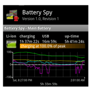Battery Spy allows you to monitor your Android device's battery level by reporting the current percentage, and providing more detailed information such as charge rate, temperature, voltage and usage times. The current battery percentage level is displayed on the notification bar. Additional statistics are shown in the notification bar pull down, and even more insight into your battery charge and usage history in the main application screen. Battery Spy works simply by gathering battery statistics that are already available in the Android OS. What you see is what the OS reports. Battery Spy gathers up the information, organizes it, then displays it in a graph and tables for you. It also uses the information to give you an estimate of time left on battery or to full charge. Statistics are gathered and saved over a settable number of days so you can review them at any time. Key features include: 1. Support for multiple battery profiles so you can differentiate between OEM or backup (after market) batteries, and different usage styles such as work, weekends and vacation. Create as many profiles as you want and quickly switch between them. This feature is available during the trial period, then only with the full license after. 2. Enable notifications for when the battery level rises above or falls below a settable percentage. This feature is available during the trial period, then only with the full license after. 3. Enable notifications for when the battery temperature rises above or falls below a settable degree. This feature is available during the trial period, then only with the full license after. 4. Quick access to settings that directly affect battery use so you don't have to hunt them down when you need them 5. Tap on the statistics table to go directly to the Android Battery Use screen. 6. Configurable graph that supports both 2D and 3D presentations. 7. Low CPU and resource consumption to not add (too much) to battery drain. 8. Run as a service when phone starts up, or manually. Try Battery Spy free for 10 days and keep using it after the trial period as a free license with reduced functionality, or purchase the full license to unlock the application to its full functionality. Even without the full license features, Battery Spy still provides a rich feature set for the casual user. Please keep the comments coming. Your input really helps to make the software better. If you have bugs or concerns, please email cmai@vertiform.com and it will be handled promptly. Thanks! Permissions Requested by Battery Spy and why * Battery Statistics - Battery Spy does not alter your system's battery statistics in anyway, it just reports what it sees. * Control of Vibrator - Used as feedback when interacting with the UI * Start at Reboot - By default Battery Spy will start when your device starts. You can turn this option off in preferences. * Full Internet Access - Battery Spy uses the Application Crash Report for Android (ACRA) library published by Google Code. When a crash occurs, you will be presented with the option to send a bug report to us. Only when you submit the bug report is internet access used. Otherwise, Battery Spy does not access the internet during its normal operation.What's new in Battery Spy 1.7